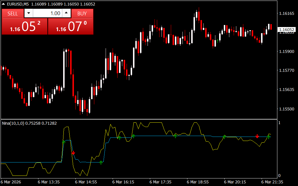 The Nina Indicator may repaint signals, meaning an arrow can appear during a candle but disappear when the candle closes.