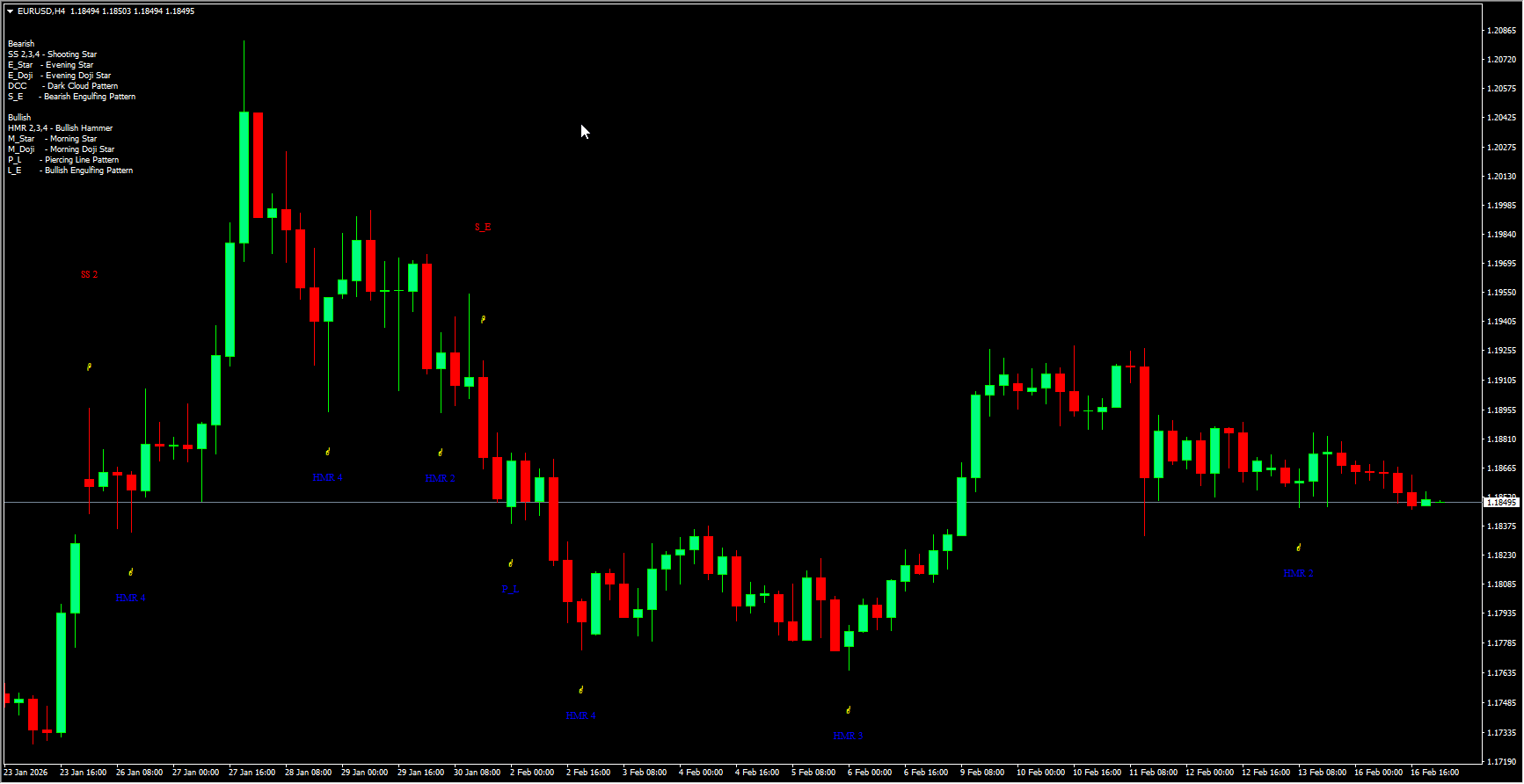 This allows traders to quickly see which candlestick patterns are forming without manually analyzing each bar.