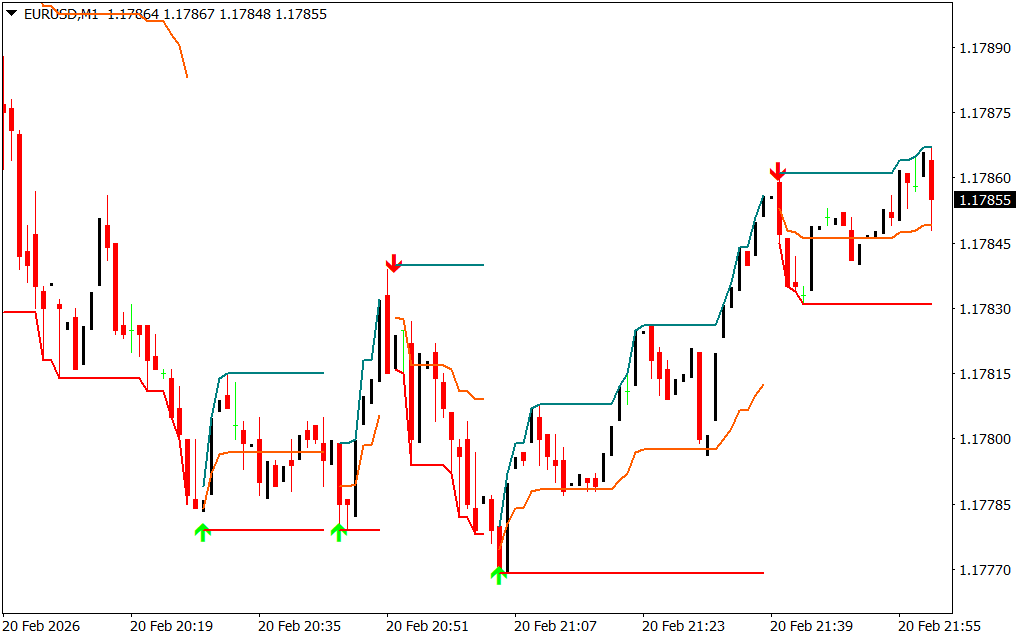 - Trailing Minimums (Green Lines/Upward Arrows) – Highlight recent swing lows; price bouncing here may indicate bullish pressure