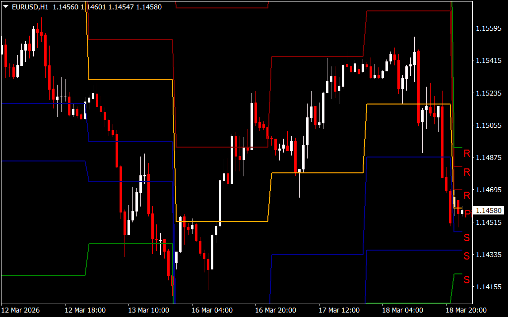 he Pivot Indicator for MT4 is a powerful technical tool that plots classic pivot lines directly on your price chart. It automatically displays the Pivot, Resistance 1 (R1), Resistance 2 (R2), Resistance 3 (R3), and Support 1 (S1), Support 2 (S2), Support 3 (S3) lines on charts up to H4, helping forex traders identify key reversal points for BUY and SELL opportunities.