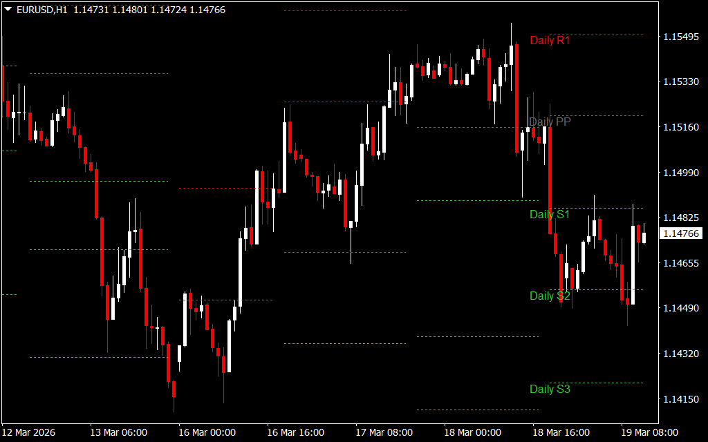 The indicator calculates pivot levels based on the previous day’s high, low, and close, then plots them on the current chart.