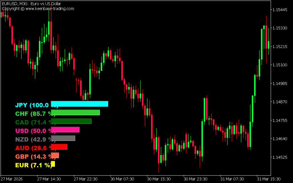 This indicator evaluates multiple currency pairs and calculates the relative strength of each currency. It then displays the results visually: