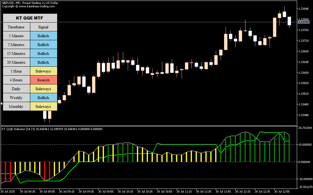 The QQE indicator enhances the RSI using a smoothing technique that improves signal clarity and trend stability. Instead of reacting to every small price fluctuation, it filters out noise and highlights meaningful momentum shifts.