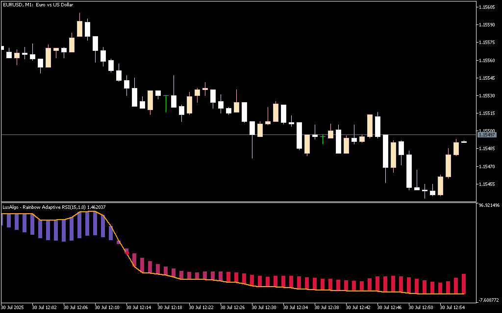 The Rainbow Adaptive RSI Indicator for MetaTrader 5, developed by LuxAlgo, is a next-generation oscillator that enhances traditional RSI analysis with adaptive sensitivity and dynamic visual feedback. Unlike standard RSI indicators that rely on fixed calculations, this advanced version adjusts in real time to market volatility, providing a more accurate and responsive view of price momentum.