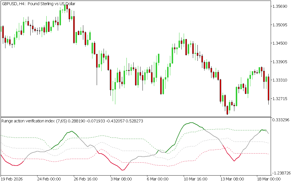 The Ravi Indicator for MetaTrader 5 (MT5), also known as the Range Action Verification Index, is a Price Action-based trend-following tool. Its primary feature is the zero line, which helps traders identify changes in trend direction when the signal line crosses above or below it.