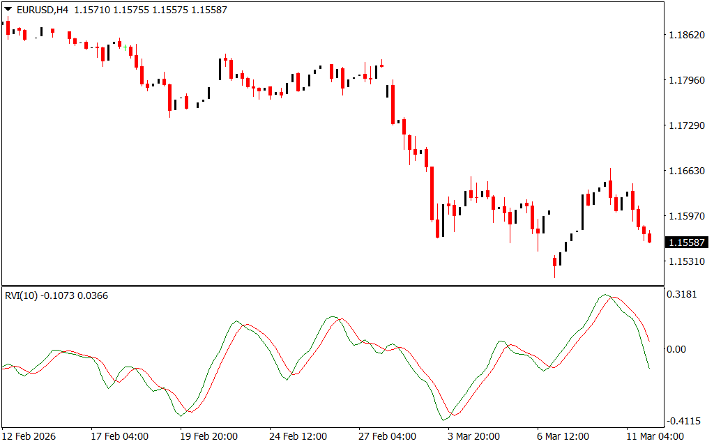 - During a downtrend, prices close near their lows, RVI falls, and the red line crosses above the green line.