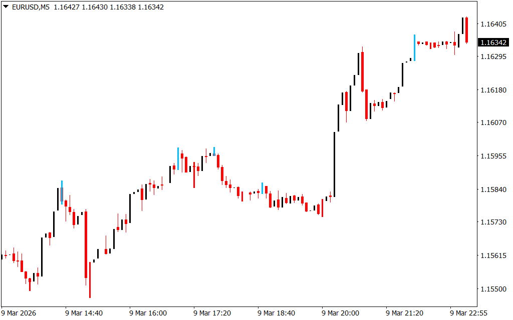 Once the indicator is installed on your MT4 platform, it will automatically highlight reversal bars directly on your chart.