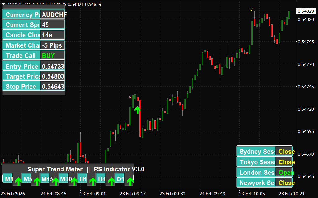 - Trend Meter – Displays real-time trend direction across multiple timeframes, helping traders align with the dominant market movement.