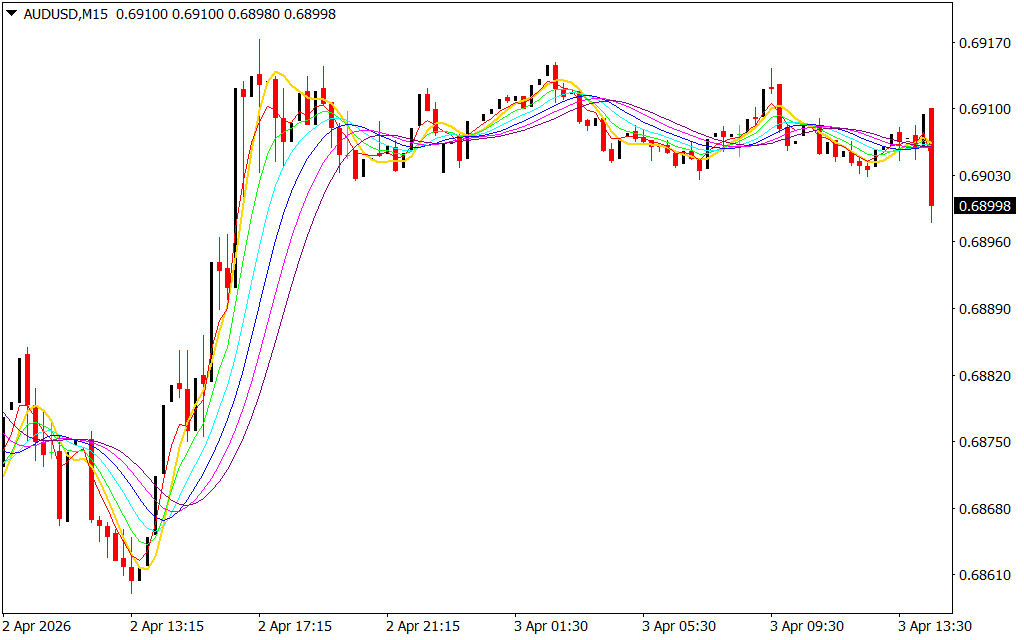 - Sell Signal: Enter a sell trade when the red line crosses below all other lines. Place a stop loss above the previous swing high and exit at the opposite signal.