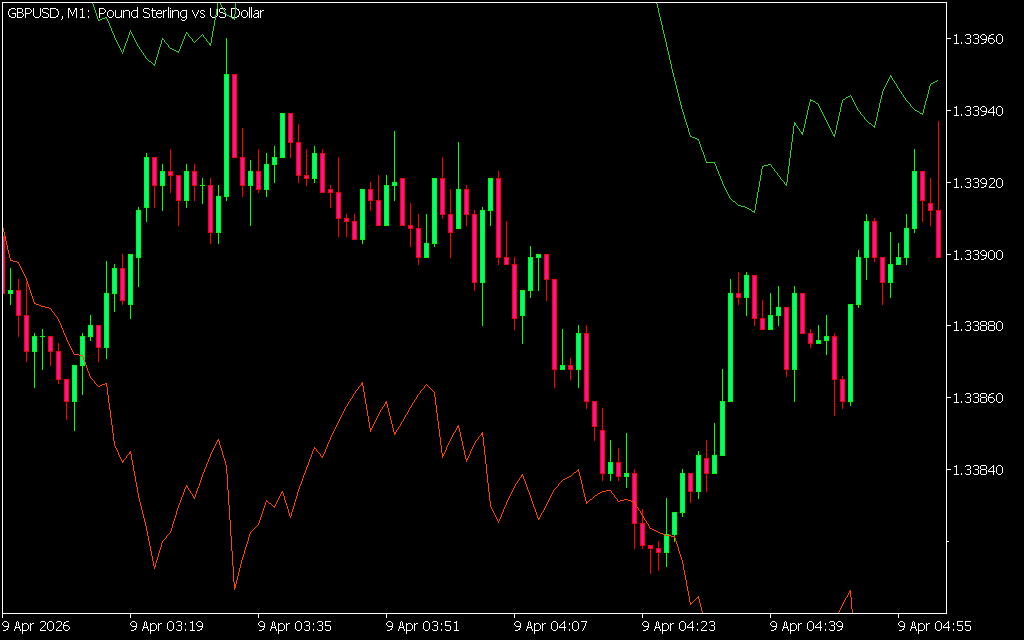 - Dynamic Bands: Green and red lines run above and below the price chart, with dotted variations showing damped values.