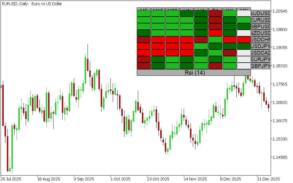 The RSI Heatmap Indicator is a multi-currency strength meter that evaluates RSI values and price direction to determine how strong or weak a currency is.