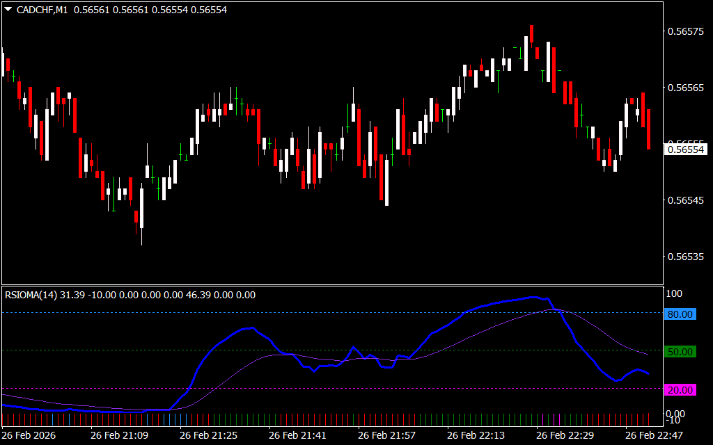- Sell signal: RSIOMA crosses below 50 → place stop above previous swing high