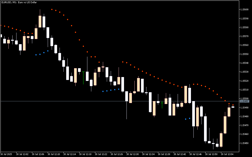 - Blue parabola below the candle → Bullish trend, potential buy signal