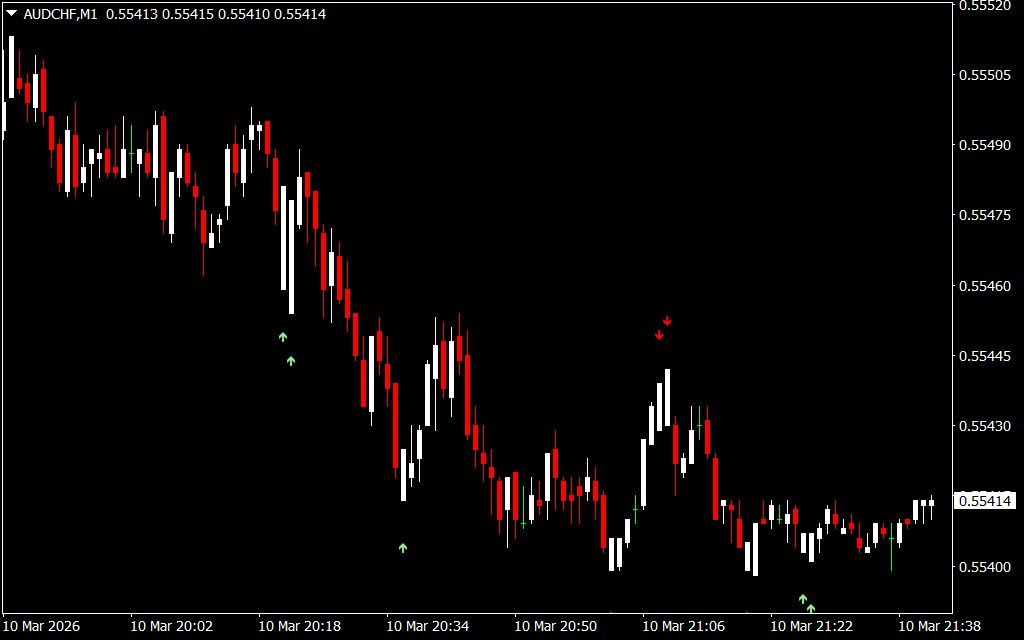 - When a green arrow appears below the candle, traders may consider opening a buy trade.