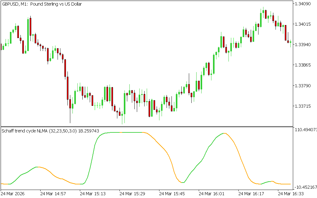 On the USD/CHF chart, the indicator generated a BUY signal when it crossed above the 25 level, turning green during the uptrend. Later, it crossed below 75, turning orange, signaling a downtrend and a short entry opportunity. These clear signals make the Schaff Trend Cycle NLMA a practical tool for trend-following strategies.