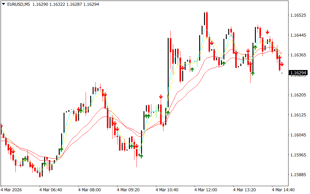 - Combines arrows and MAs for better trade confirmation
