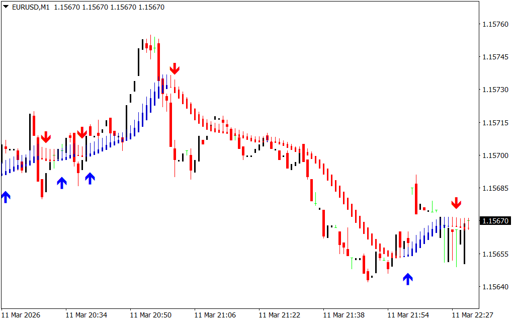 After installing the indicator on your MT4 trading platform, it will display arrows and colored bars directly on the chart.