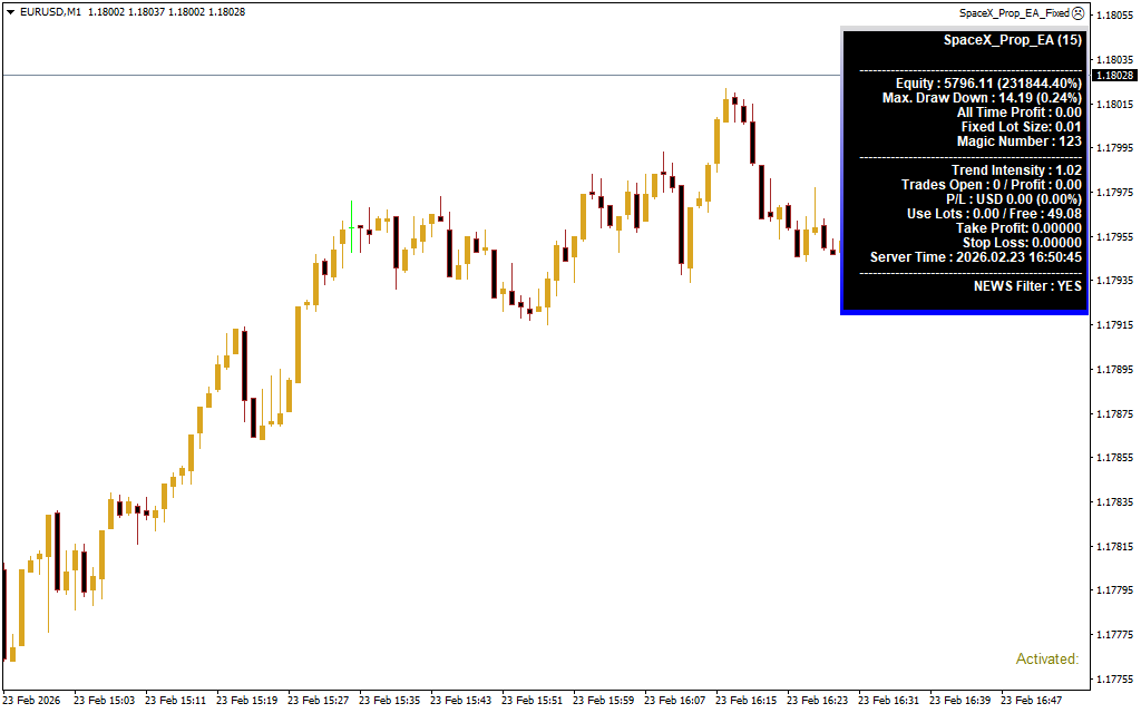 During extensive testing, SpaceX Prop EA impressed with its robust performance across trending and ranging markets, maintaining low drawdowns and precise trade execution. Its ability to adapt dynamically to market conditions makes it suitable for a wide range of trading environments.