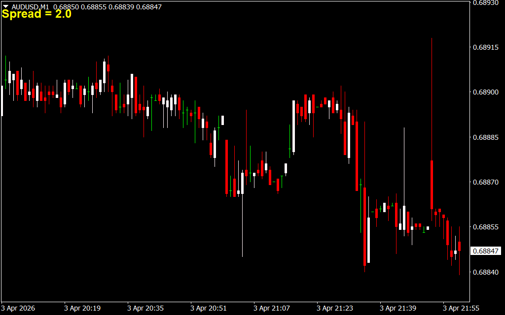 The Spread Indicator measures and displays the magnitude of the spread directly on your MT4 chart. It records spread values while active, allowing you to review past data samples at a glance. This makes it easy to identify spread behavior during normal trading conditions and volatile events like major news releases.