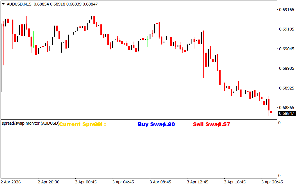 - Swap (Rollover Fee): The interest rate applied to positions held overnight. The indicator shows both buy and sell swap values, allowing traders to anticipate potential costs.