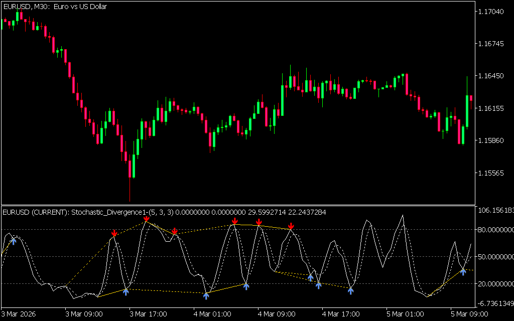 The Stochastic Divergence Indicator for MT5 is a powerful tool that helps forex traders identify divergences between Price Action and the stochastic oscillator. Divergences often signal potential trend reversals or continuations, making them a valuable addition to any trading strategy. This indicator automates the process, ensuring traders never miss a signal.