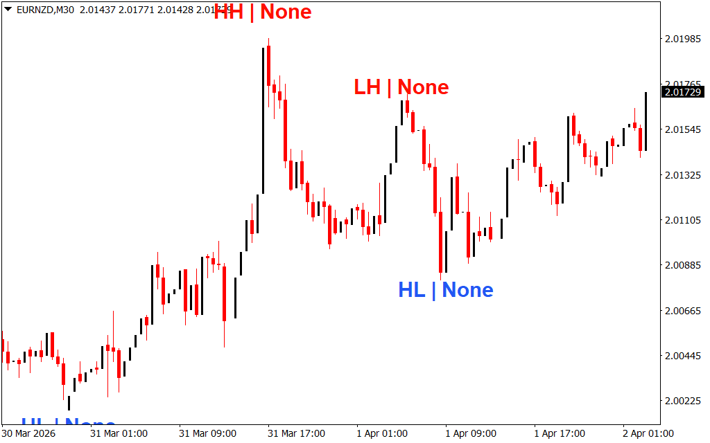 - Swing Labeling: Detects swing highs and swing lows and labels them as Higher High (HH), Higher Low (HL), Lower High (LH), or Lower Low (LL).