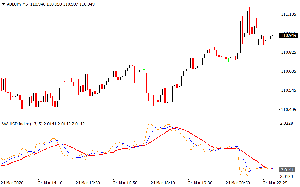 The indicator plots a red currency index line, along with two moving averages: