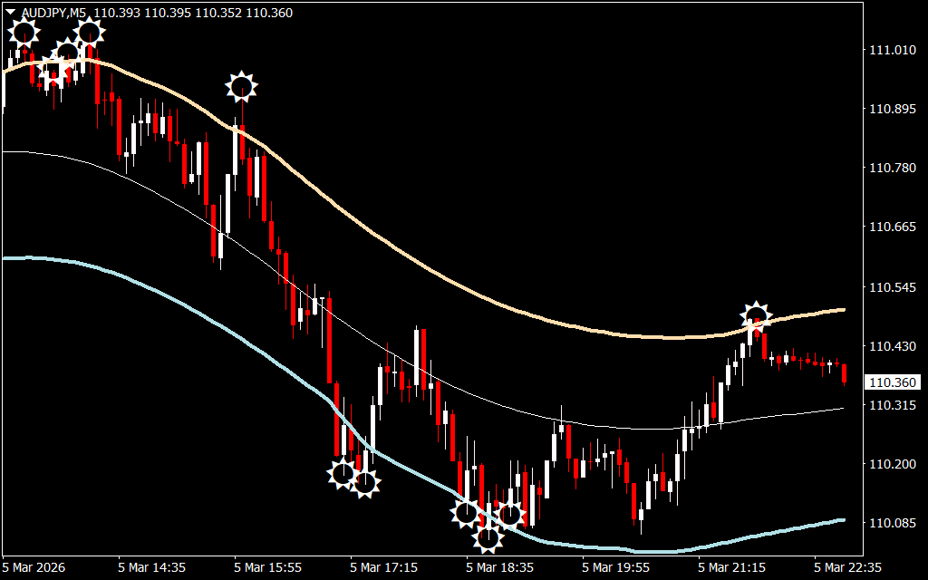 On a EUR/USD M30 chart, price may break below the lower band and form multiple wick rejections, suggesting that selling pressure is weakening. If the indicator prints a buy star and the price moves back inside the band channel, a bullish engulfing candlestick may confirm a potential buy opportunity.