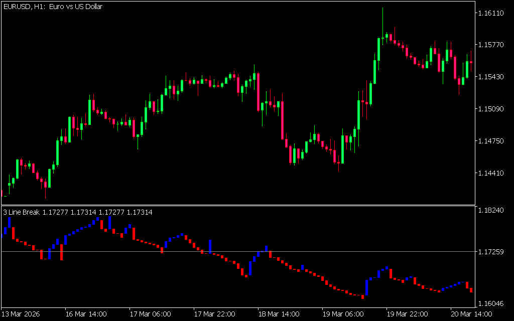 The Three Line Break system builds price “lines” instead of standard candles. Each new line is created based on the closing price of the previous bars, not intrabar highs or lows.