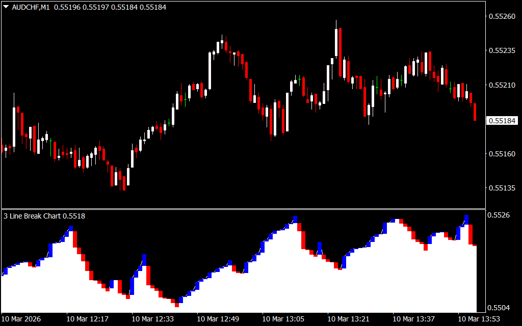 The Three Line Break V2 Indicator uses color-coded bars to display market trends: