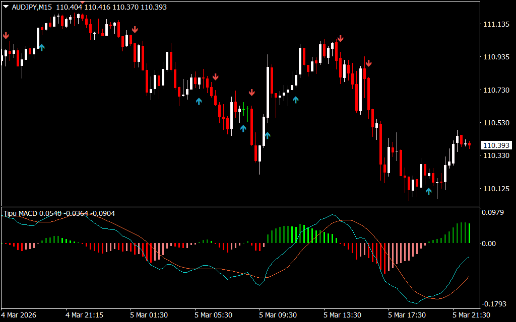 The Tipu MACD Indicator for MT4 is an enhanced version of the classic Moving Average Convergence Divergence (MACD) indicator. It adds visual arrows and alert notifications to the traditional MACD signals, helping traders easily identify bullish and bearish opportunities.