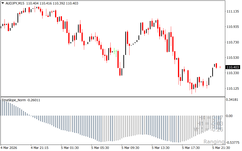 The TMA Slope Indicator for MT4 is a trend-following oscillator that generates trading signals using the Triangular Moving Average (TMA). The indicator displays a color-coded histogram that helps traders quickly identify bullish, bearish, and neutral market conditions.