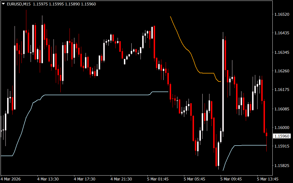 - Trend Lines for Guidance – The indicator plots a blue line below prices for bullish trends and an orange line above prices for bearish trends, helping traders visualize market direction.