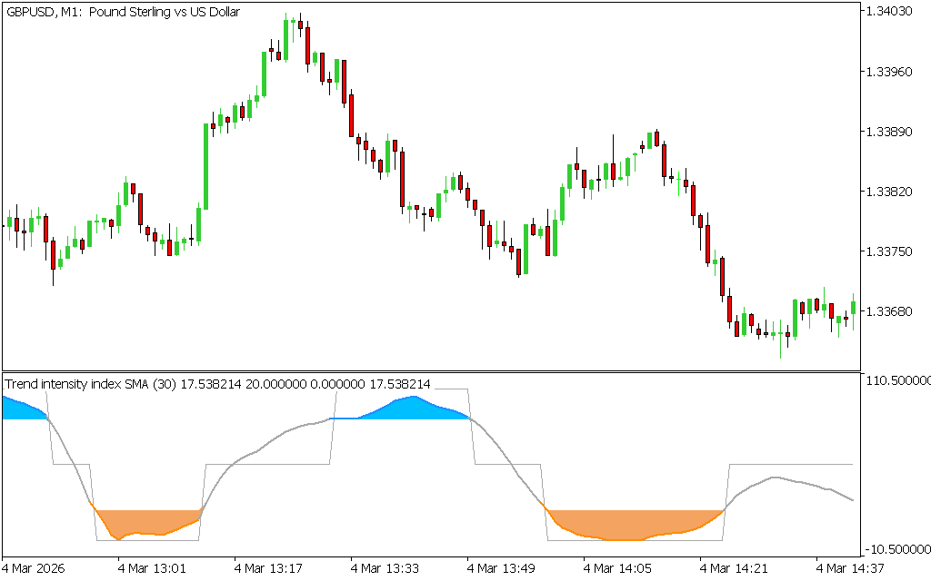 The Trend Intensity Index Indicator for MT5 is a powerful technical analysis tool designed to measure market direction and the strength of price trends. It helps traders identify whether the market is trending strongly, weakening, or entering consolidation.