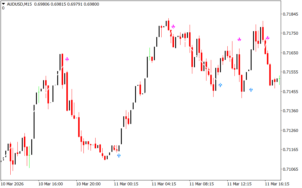 Example: On an AUD/USD H4 chart, the indicator displays the following signals: