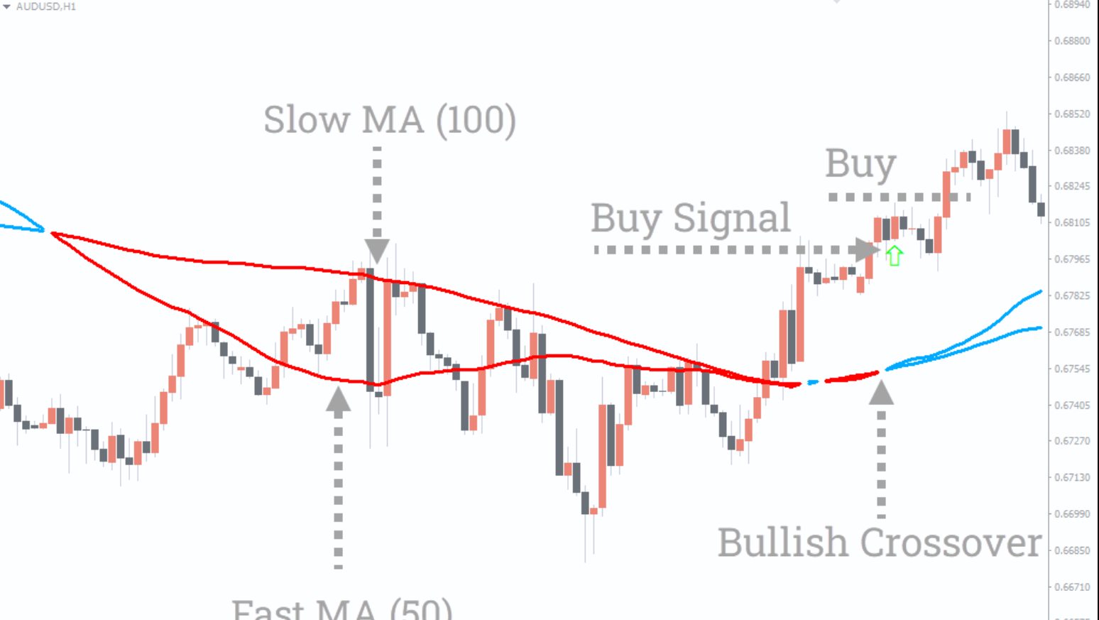 - Bullish crossover: Fast MA (50) crosses above Slow MA (100) → green arrow and blue MAs.