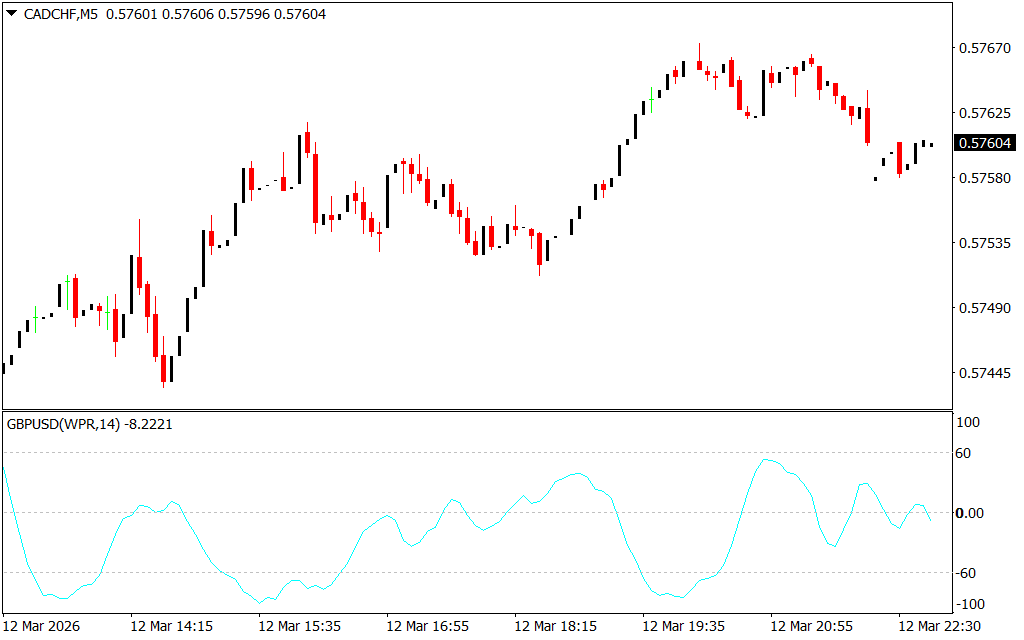 The indicator displays a single oscillating line that moves between -100 and +100 based on William’s Percentage Range calculations. These levels help traders determine when the market may be overextended.