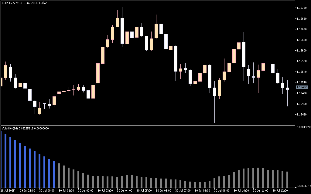 - Enter trades during periods of high volatility (royal blue bars) for stronger price movements.