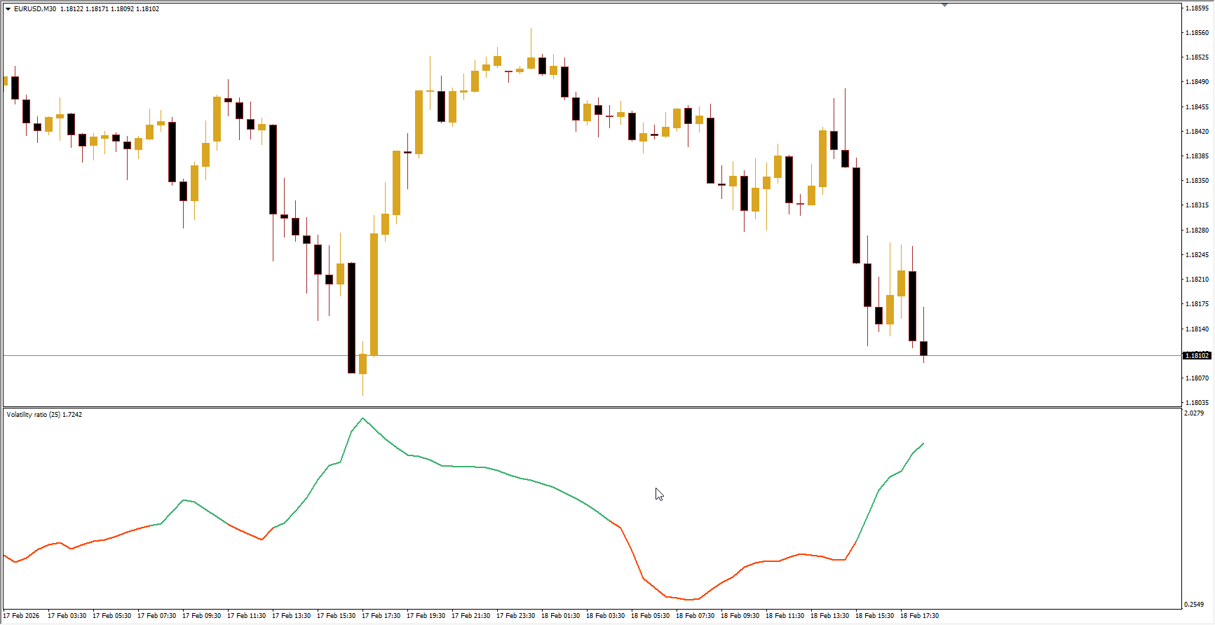 The Volatility Ratio Indicator measures forex market volatility by comparing current price deviations relative to historical averages. It is displayed in a separate MT4 window:
