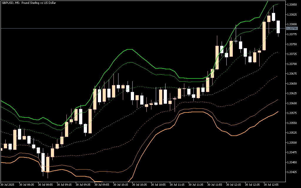- Middle Line (VWAP): Represents the fair value of the trading instrument