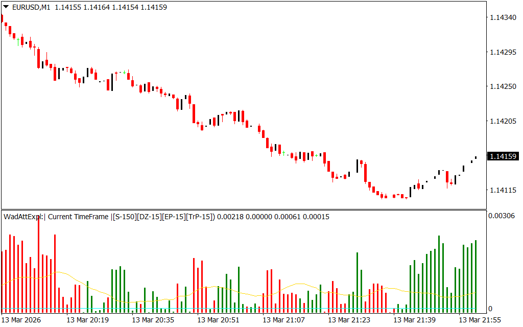 In addition, the indicator plots an explosion threshold line, which acts as a momentum filter. When the histogram crosses above this line, it signals a strong market move. Because of its simplicity and clear visual signals, the Waddah Attar Explosion indicator can be used on any forex pair and across all timeframes.