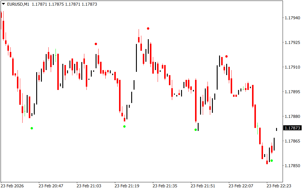 - Visual Reversal Signals: Red dots above the price indicate potential sell opportunities, while green dots below the price signal potential buys.