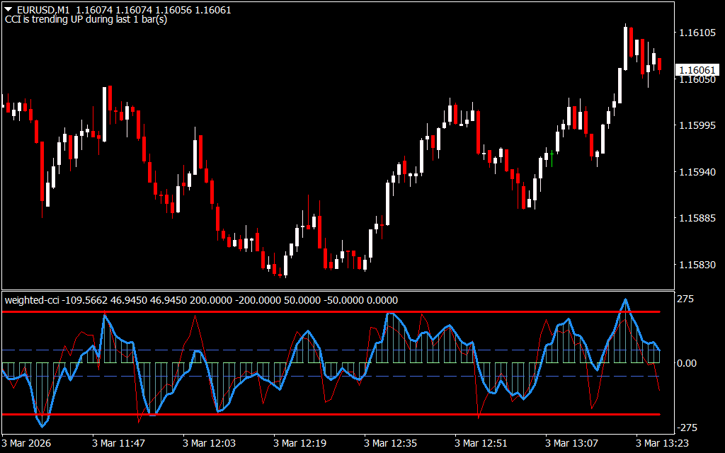 The Weighted CCI Indicator for MetaTrader 4 is a custom technical tool based on the Commodity Channel Index (CCI), designed to enhance trend analysis and identify potential trading opportunities. Unlike the traditional CCI, this version uses a weighted period, making it more sensitive and responsive to market changes.