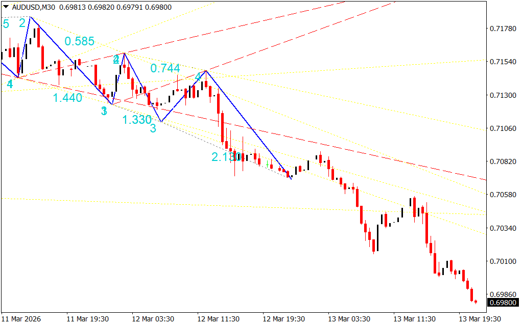 The Wolfe Waves Indicator scans the chart and identifies a five-wave pattern. Notice how Wave 3 and Wave 4 remain inside the channel formed by Wave 1 and Wave 2, confirming the validity of the structure.