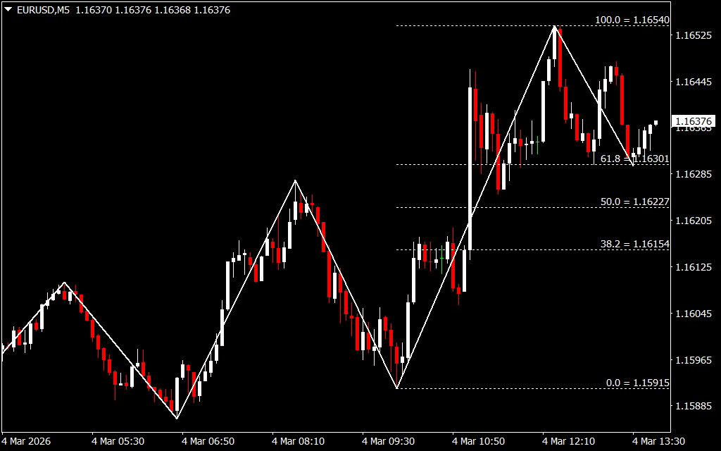 - Fibonacci Retracements – Automatically plots Fibonacci levels from identified Zigzag highs and lows