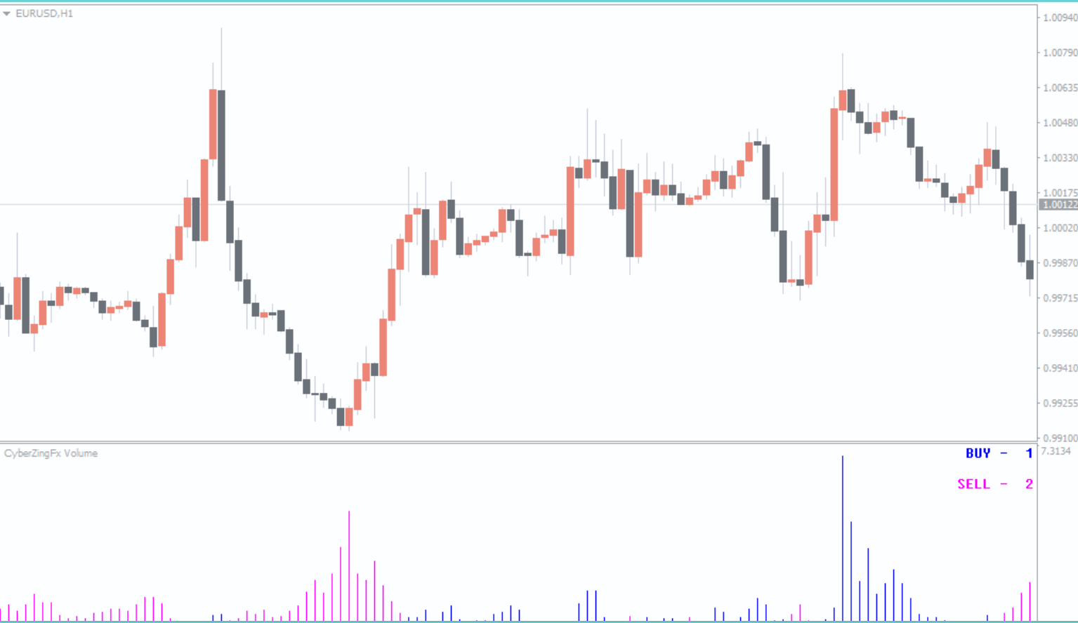 The ZingFX Volume Indicator analyzes price peaks and trading volume using built-in algorithms. Based on these calculations, it displays colored histogram bars below the price chart to show the current market condition.