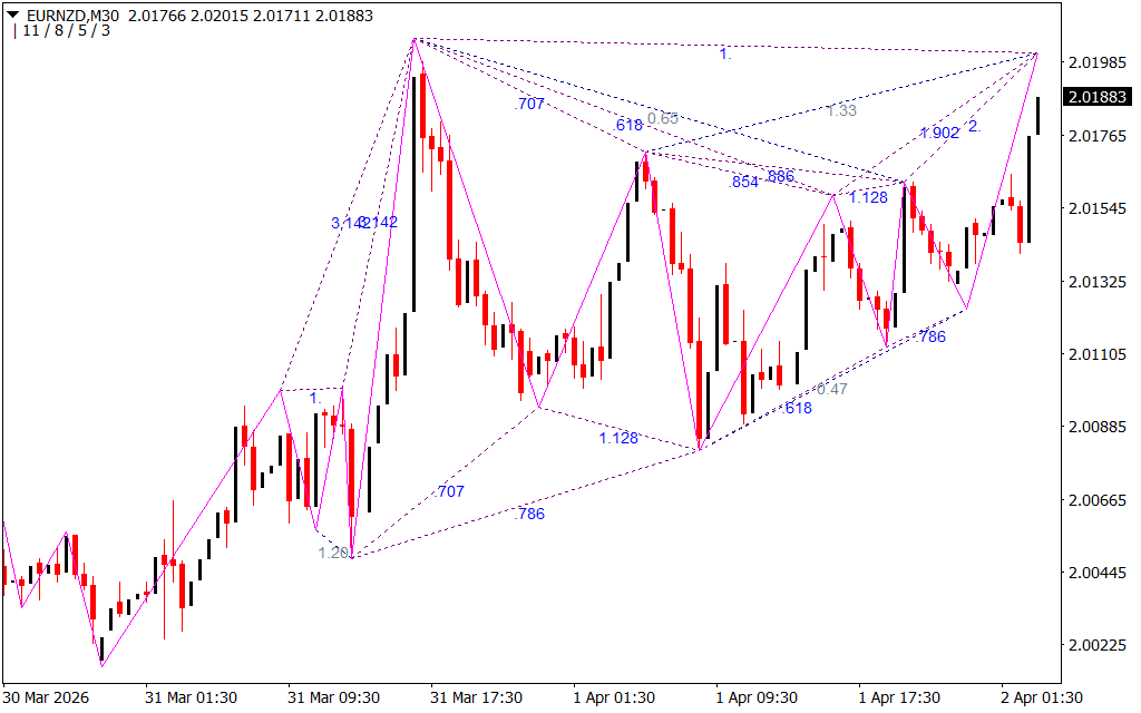The ZUP indicator identifies key harmonic patterns, including:- Bat Patterns