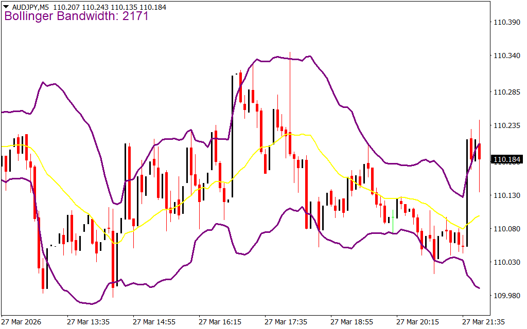 - Bandwidth Display: Shows the current distance between bands in pips on the top-left corner of the chart.