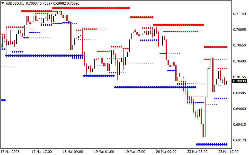 - Displays support levels (blue dotted lines)