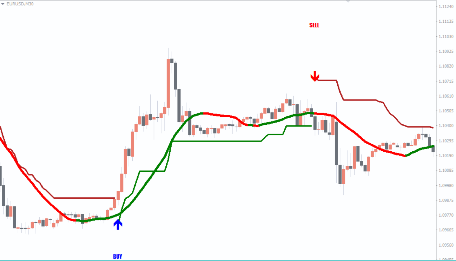 When applied to a pair like EURUSD on the M30 timeframe, the indicator generates signals based on arrow direction and trend alignment.